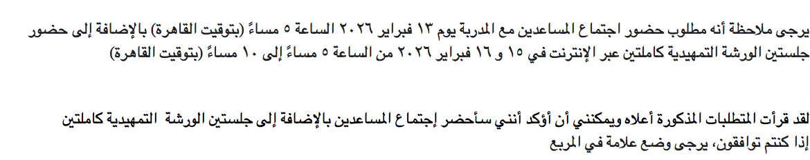 Please note that it is required to attend the assistants meeting with the teacher on the 13th of Feb 2025 at 5pm (Cairo Time) as well attending both online sessions of the Introduction in full on the 15 & 16 Feb 2026 from 5pm to 10pm (Cairo time).
